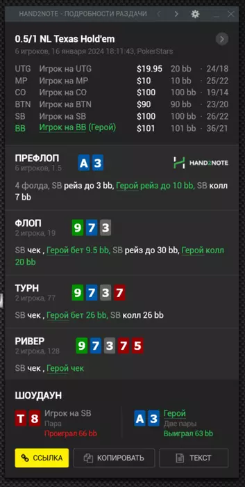 Оппонет обычный рег. Статы wwsf(46)/WonSD(54)/wtsd(28).Агрессия по улицам 40/30/28. Стил с СБ 47. Фолд на 3бет на СБ 58.