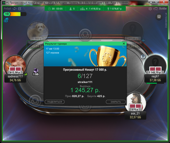Всем привет пока отдыхаю , катать начну с середины сентября уже прям плотно, сегодня утром сыграл 5 турниров чтоб не забывать как кнопки нажимать плюсанул около 16 баксов) гл гл тащите