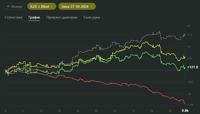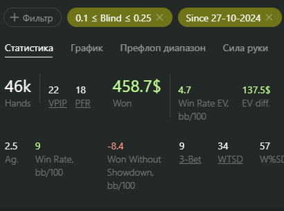 на нл25 пока что тяжело, осталась привычка с нл 10 вельюбетить все подряд, в результаты чего вельюбетим сами себя, да и цифры морально тяжелые большие - 4би -10тыс, два дня непруха -20, хотя я не первый раз туда добираюсь, раньше за счет бонусов