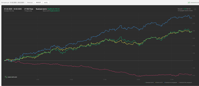 В 2025 собираюсь наиграть за 2-3 месяца 100к рук на фул фокусе, посмотреть ев и если оно меня устроит, буду дальше играть от себя, если же нет, то пойду в фонд. Планы на следующий год Наполеоновские, буду почаще писать в блог(не знаю кому вообще интересно за мной следить, писанина будет скорее в качестве мемуаров для самого себя).