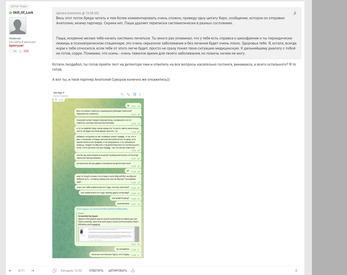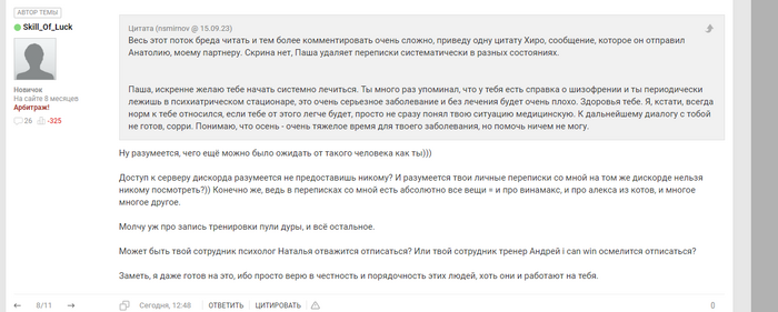 nsmirnov @ 15.09.23Весь этот поток бреда читать и тем более комментировать очень сложно, приведу одну цитату Хиро, сообщение, которое он отправил Анатолию, моему партнеру. Скрина нет, Паша удаляет переписки систематически в разных состояниях.