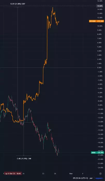 Набрал шортов по BTC 11 октября в основном потому что наблюдаемые индексы SPX и ARKK выглядели на грани обвала в тот момент. Исходя из наблюдений по одному только битку у меня не хватало уверенности что он будет падать в средне-сроке. Ожидания были что он в худшем случае будет какое-то время болтаться на месте пока всё вокруг падает, что уже случалось уже раньше. Но всё пошло не по плану: