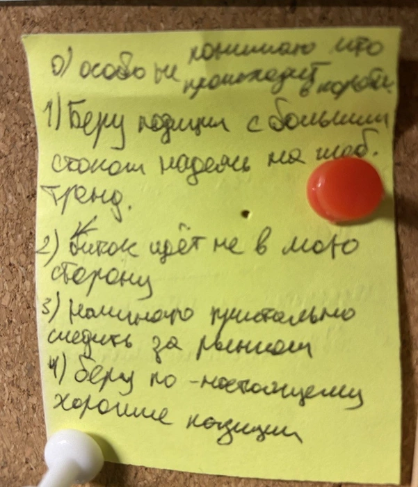 В итоге ликвиднуло шорт на бинансе во время резкого шорт-сквиза по 29400. Осталась часть шорта на байбите. Фонда продолжила падать, но рост битка не был похож на окончание восходящего движения(согласно моей основной страте). Это меня сильно беспокоило в тот момент: продолжать удерживать шорт предполагая что в долго-сроке всё-равно упадёт, либо закрыть сейчас из-за опасений продолжения роста в средне-сроке. (Раньше у меня был опыт долгого удержания изначально убыточных шортов, что-то около полу-года если память не изменяет. Но в итоге я зарёкся больше так не делать). Чтобы принять верное решение начал смотреть свои заметки хаотично расклеенные по доске. Нашёл старую заметку, которую видимо написал после какой-то прошлой неудачной ситуации.