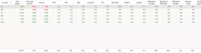 то обрати внимание что у тебя на разных позициях не сильно отличаются значения, из этого предположение, что ты трибетишь один и тот же диапазон со всех поз и совсем чуточку шире с баттона. Так быть не должно. Трибеты со всех поз должны быть выше и по разному выстраиваться диапазоны в зависимости от того на какой позиции мы и с какой позиции открылся оппонент.