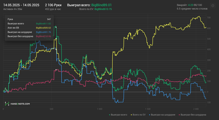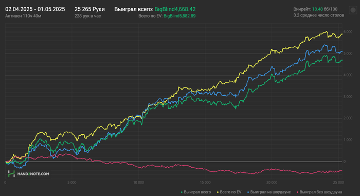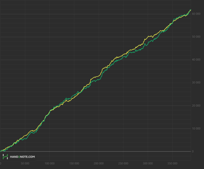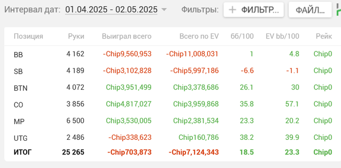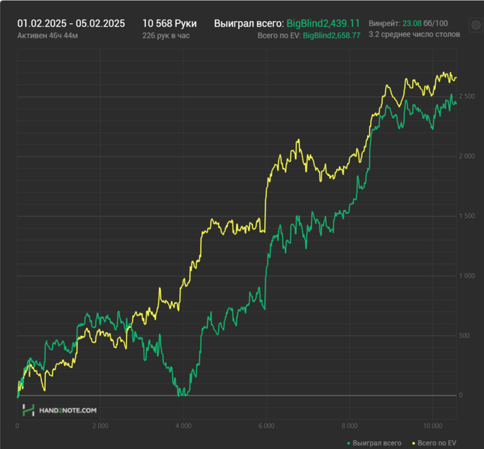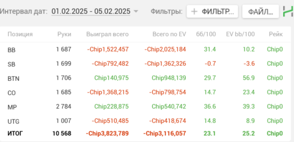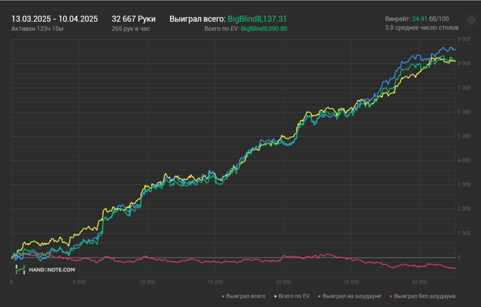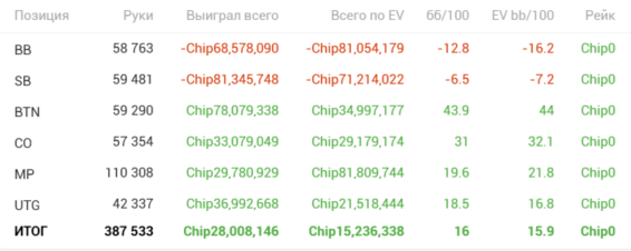 Месяц назад Dreamteam назначили мне нового тренера, с которым я ещё не занимался. Каким-то образом он смог очень быстро поправить мои косяки, то ли объяснил хорошо, то ли нашёл подход, я не знаю, но в общем результат в плане EV не заставил себя ждать и частоты значительно улучшились. И как подарок с небес, апчик вовремя пришёл и смог конвертировать EV в $, к тому же в нём улучшать игру и обкатывать новые страты это отдельное удовольствие. Вот результаты спустя месяц после первого занятия. Ещё в районе 500$ плюсанул на покердоме.