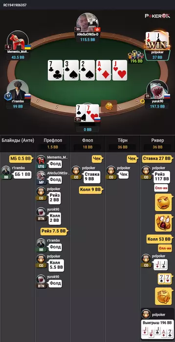 Вот не умею я пока что такое сбрасывать) На флопе думал у него А7 пиковые, раз ставит так плотно. В пары старше доски не верил, потому что открывался он в 2бб. В туза на терне он не ставил. На ривере на мою плотную ставку пушит. С чем? Одну руку ему смог тут придумать - А7. Вколил. Сет в сет. Впип у чувака 24. Был бы хотя бы 17, я б сбросил не думая.