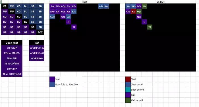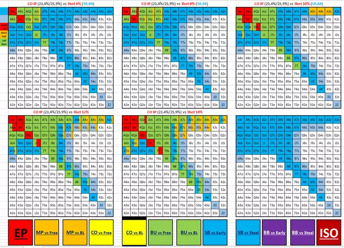 У меня нет стат типа фолд на 4бет CO vs EP, есть только по позиции, а также IP и OOP, этого вполне достаточно. Все трибеты в одном месте. Все тотал статы в одной колонке. Фолды всегда рядом с предыдущем активным действием. Дифференциация по цветам - чисто по характеру агрессии (беты, рейзы - красные, чеки-коллы - жёлтые, фолды - синие). Сами статы не слишком плотно друг к другу - когда пространство разряжено, как по мне, это лучше для восприятия, особенно общей картины. Ещё очень важная штука - цветовые диапазоны, чаще всего на фолды, - их можно применять на несколько стат скопом. Например, для фолдов на 4бет у меня сделано: ниже 40 - раскрашивается темно синим, выше 60 - ярко голубым. Точно выверенные пороговые значения для каждой позиции не важны - главное, чтобы это позволяло быстро оценить общие тенденции. Как-то так.
