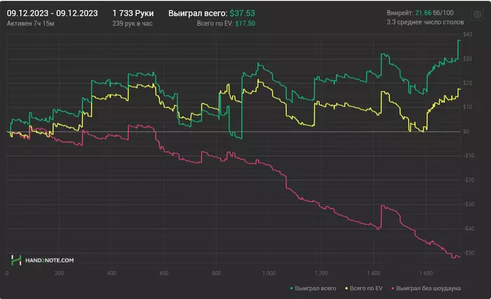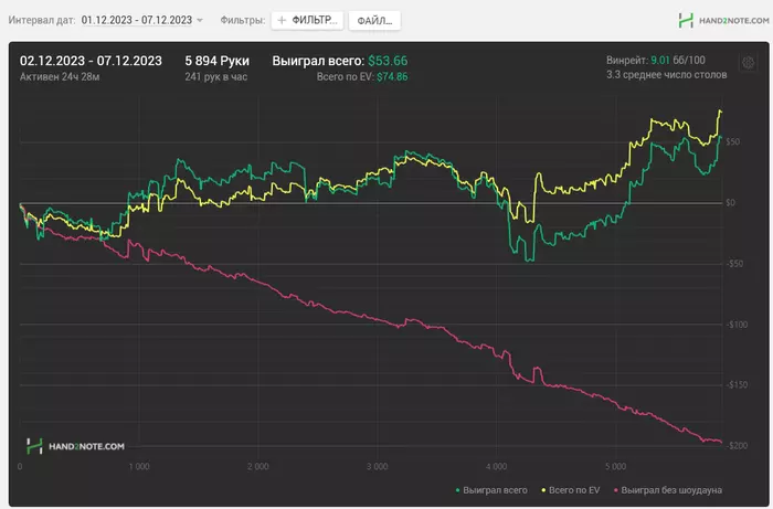 75% дистанции позади, подводим предварительные итоги! Последние несколько сессий чувствую себя уверенно, подтянули немного винрейт, уверенно держимся в топе игроков на Старзах , на своём лимите. Заметил кстати, что Х2Н всё-таки и на старзах теряет раздачи, так что результат может не соответствовать статистике немного... А я ещё такой игрок, который отказывается смотреть кассу до конца месяца, поэтому полную картину событий я увижу, когда буду подводить итоги месяца ( профит, РБ, челенжи и т.д. ).