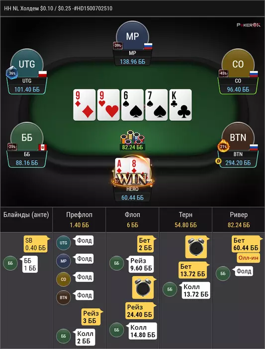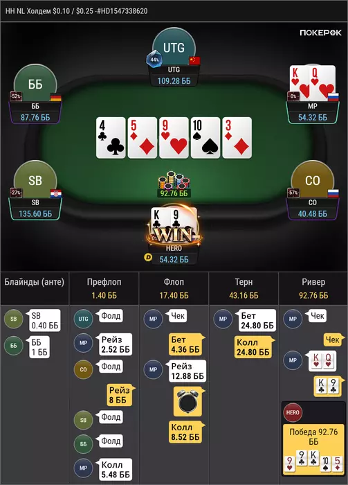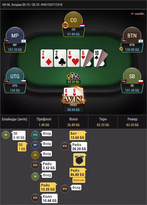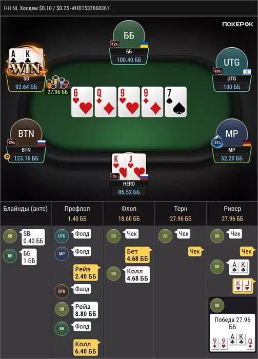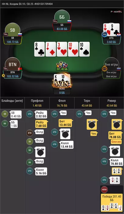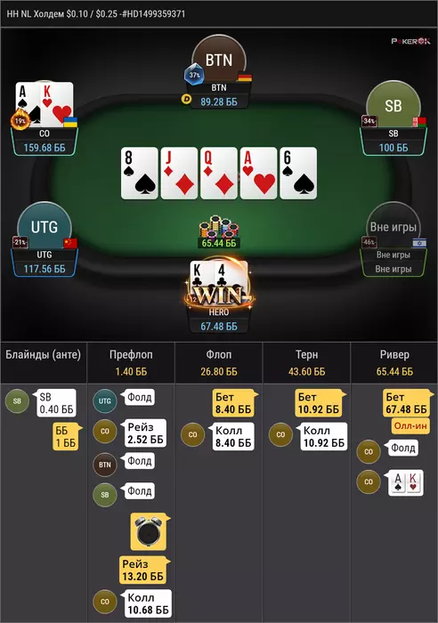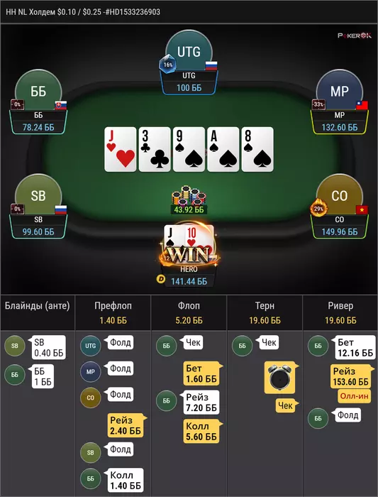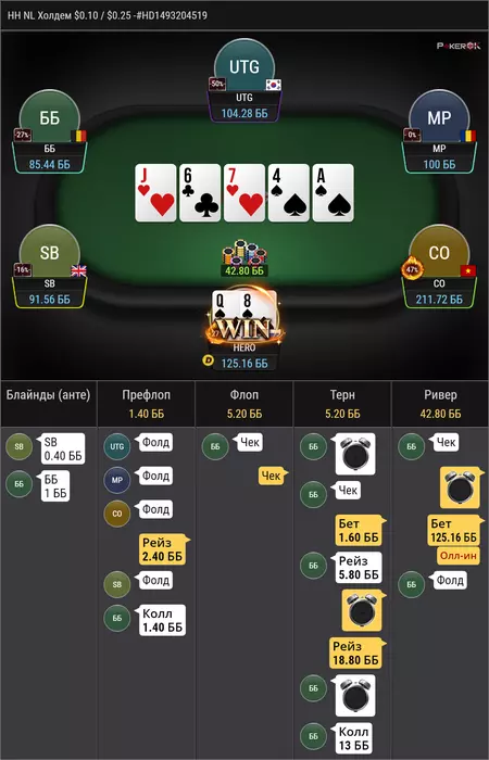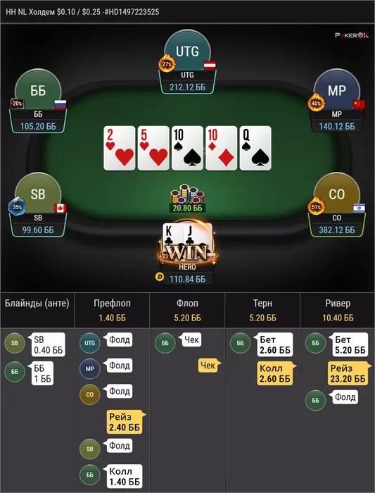 против рега, который за ренджами играет, в целом по этому префлоп бы часто колил, но сайз конечно неприятный, удивлен был чеком на флопе, мне тяжело понять какой там рендж чека, ну поставить 1/4 думаю норм у нас очень много эквити, получил пуш ну и легко заколил, но интересно почему мой опп выбрал эту ветку, при том, что мне тяжело тут оверфолд придумать, учитывая что у меня тут в полном весе AA и TT и не редко QQ, разве что, против дро он неплохо едет. мне кажется, что интреснее было бы сыграть прямым пушем на флопе, т.к отколить JJ уже прям не просто, так же как и 87, 76, 65, этих рука мало, но скорее всего они должны были бы нажимать колл.