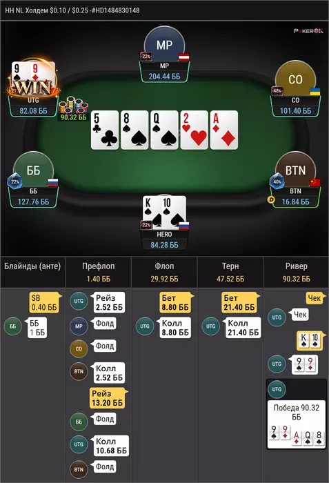 против рега, флоп думаю любое действие было бы норм, ну и на рейз легкий колл, терн можно было блокнуть, но чек мне нравится больше, ривер интересно? логичных флешей там близко нет в каком то небольшом весе KT QT T7 т.к их очень хочется по терну продолжить и по сути самое важное, что он будет делать QT без блокера на флеш и чекает ли он терн 33 в каком то весе, ну а рука у нас хорошая для блефа вроде, не уверен что пуш лучше чем колл, но уверен что он не минусовый