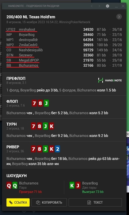 Касательно эксплойта ботов, выскажу некоторые предположения. Удалось мельком посмотреть алиас, что они там наигрывают. Бросилось в глаза необычное распределение частот чек-рейзов по улицам (8% флоп и терн, 12% ривер). Мягко говоря, нетипично для большинства регов. Взглянув на наполнение, родилась мысль, что есть существенная вероятность, что эти боты обмениваются инфой о своих картах, когда играют за одним столом. Прикладываю пример раздачи, которая иллюстрирует это предположение. Выглядит как лютая наркомания - отсутствует дефолтный трибет префлоп, который ставится 100% весом, флоп зачем-то чек колл и ривером следует неожиданное превращение руки в блеф. Интуитивно легко догадаться, что для такого блефа обязательно наличие блокера на натс флеш, особенно против диапазона утг, + QQ блочат автофолды. В обычной ситуации такой блеф будет очень минусовым (около -5 бб в гто мире). Но если знать, что А нужной масти заблочен кем-то другим, К на доске, Q у нас в руке, то получается офигенная ситуация, чтобы очень плюсово запушить. Пробежавшись по никам игроков в данной раздаче, оказалось, что за 8 макс столом сидит всего 3 (!!!) кожаных мешка, против 5 ботов (если, конечно, нет ошибок в вышеуказанном списке). Так что ничего не мешает им получать дополнительное преимущество, используя инфу о картах друг друга, что весьма усложняет процесс их обыгрывания и эксплойта дыр в их страте. На скрине красным подчеркнул ники ботов.