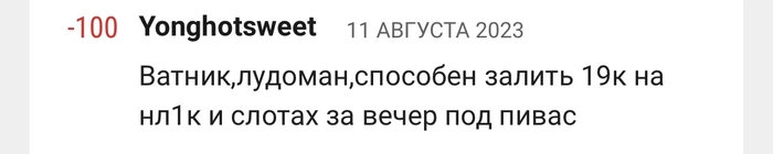 Почему большие деньги сваливаются на голову большим лудоманам🤔 В теории наверное это плюсово быть лудиком и играть всегда по макс бету и все заливать в надежде на один большой занос. Но мозги потом становятся настолько отравленными что и после заноса продолжается игра по макс бету, а от потери уже такого капитала наверное можно свихнуться, вот больные мозги и продолжают судорожно искать возможность снова депнуть и ощутить этот адреналиновый укол. Замкнутый круг адской лудомании. Тс эх печальна твоя доля.