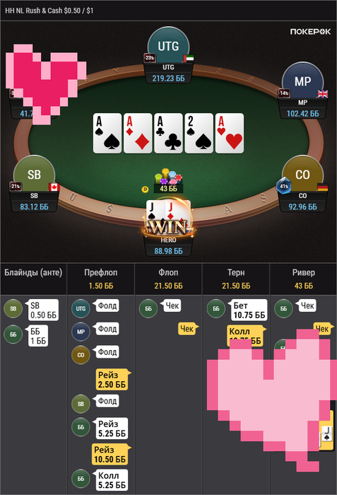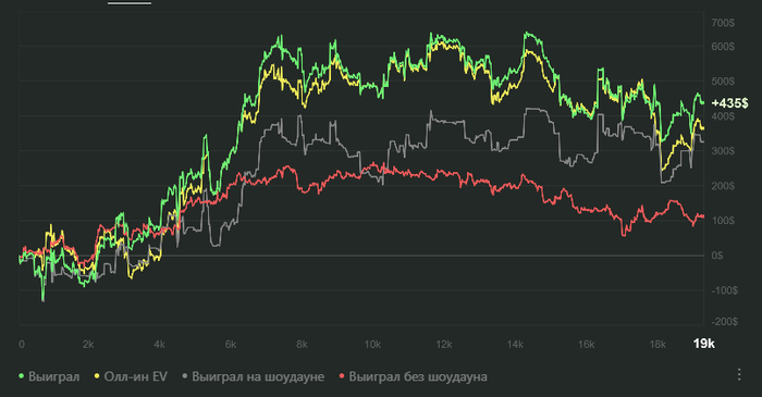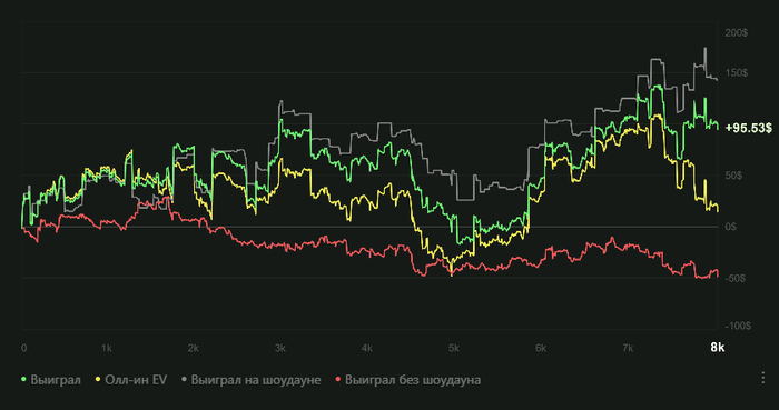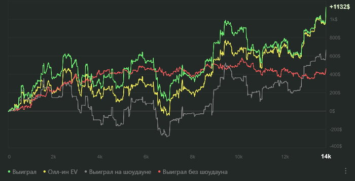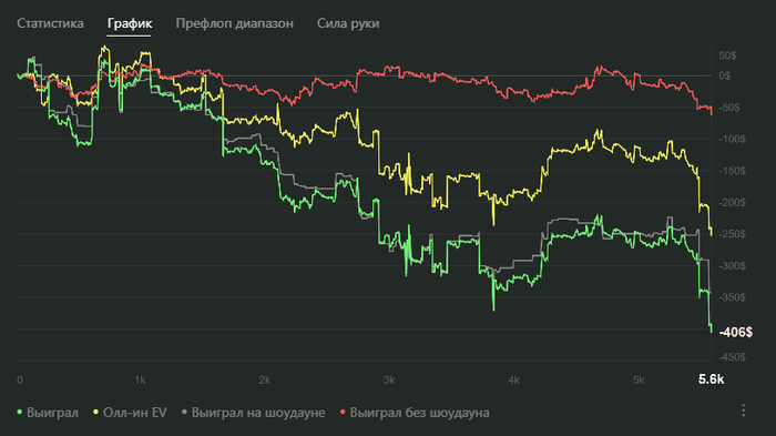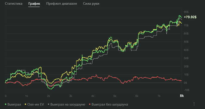 За первые 5к рук выиграл уже достаточно чтобы спать спокойно и была мысль выходить по тейку, но, во-первых, тейк я заранее не обдумывал, а придумывать на ходу это отсебятина, а, во-вторых, если уйти то получилось юы не покерная вахта а фуфло какое-то и продолжил катать.