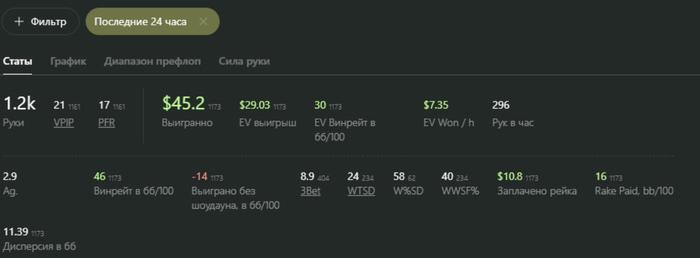 Результат за последний месяц с упором на усвоение нового материала: +$175, 24 бб/100, при 14 бб/100 рейка, EV won/h 3,77$, 296 рук в час.