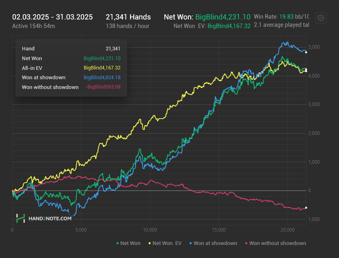 В начале месяца действительно не складывалось. В важных дипах ощутил весь спектр эмоций от переездов в 1,2,4 аутов. Эта боль, кстати, происходила на Покерке. Там же и закатал большую часть бай-инов - не зря от себя практически не играл этот рум.