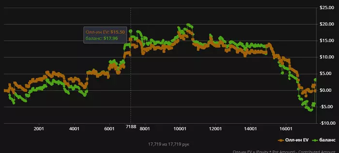 Сегодня очень показательный день. Посмотрел на график и обнаружил у себя предрасположенность к лудомании. Что заставило меня открыть столы после залива 4 БИ? Выходит не могу остановиться когда сливаю стэк за стэком. Может быть в этом кроется одна из причин неудачных попыток раскрутиться, с другой стороны деньги не давят, я же играю в удовольствие. А может, потому что понимаю: 10 БИ очень мало для быстрого покера. В любом случае на графике изображена не только дисперсия, но и состояние тильта и как следствие грубейшие ошибки. C пиковых 37 баксов упали до 19,50. плюс призрачные шансы в GG care 11вв стэк. Ах да и рейкбек завтра должен в кассе оказаться.