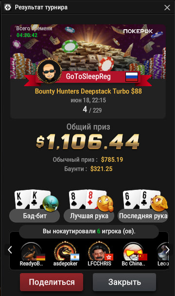 Покатали сегодня MAIN KO по 880y.e (1100$~), заключительный турнир серии в Сочи. Затащили, где то складывалось, постарались показать А игру.