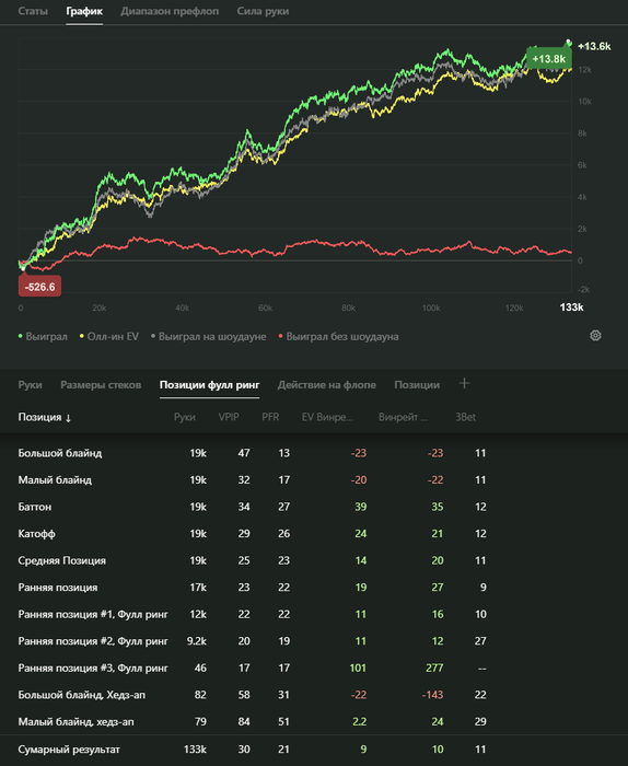 Психологическое спокойствие в таких ранах сохранять очень сложно, особенно когда не добираешь длительно АИEV в дорогих дипах, в некоторые дни постоянно матерился про себя в стиле "**ал эт казино", хотя я крайне тильтоустойчивый по моему мнению человек. Парадокс выборки в том, что в лейте имею переапанные 9бб/100~, при этом на деньгах это вообще не как не сказалось.