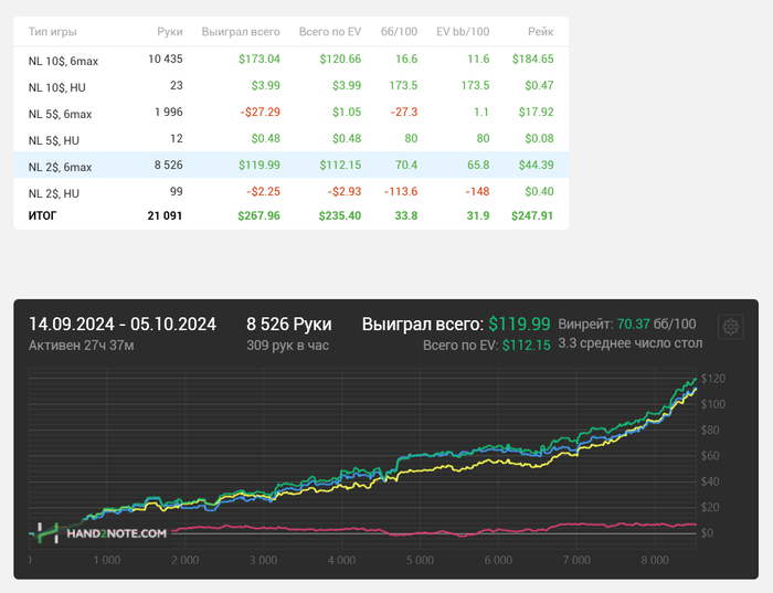 С середины сентября я стартанул с 20$ и начал потихоньку катать. (за сентябрь сыграно мало раздач, в октябре 1к рук в день в среднем выкатываю)