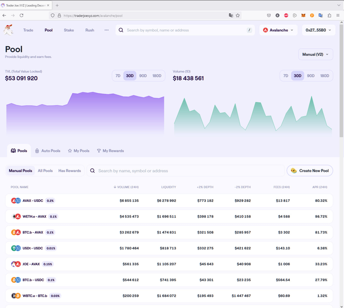 На каждой DEX (децентрализованной бирже, вроде traderjoexyz.com (http://traderjoexyz.com/)) есть раздел Pools с характеристиками: