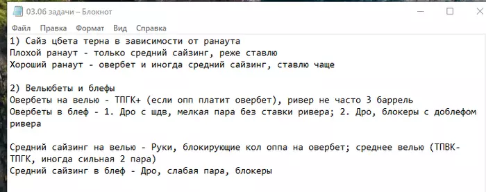 Очень помогли тренировки от старшего товарища(хвала этому филантропу!), цеплялся за них как за соломинку утопающий. Конспектирую тренировки по тайм-кодам. Но нужно чуть больше времени чтобы всё успеть. Перенесенную с пятницы задачу в долгий ящик откладывать не надо. За ней уже в очереди стоят другие задачи по повторной отработке срп ип спота, а затем 3бет поты.