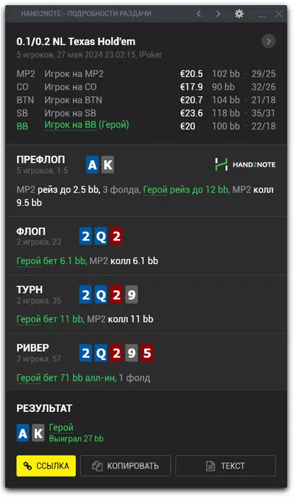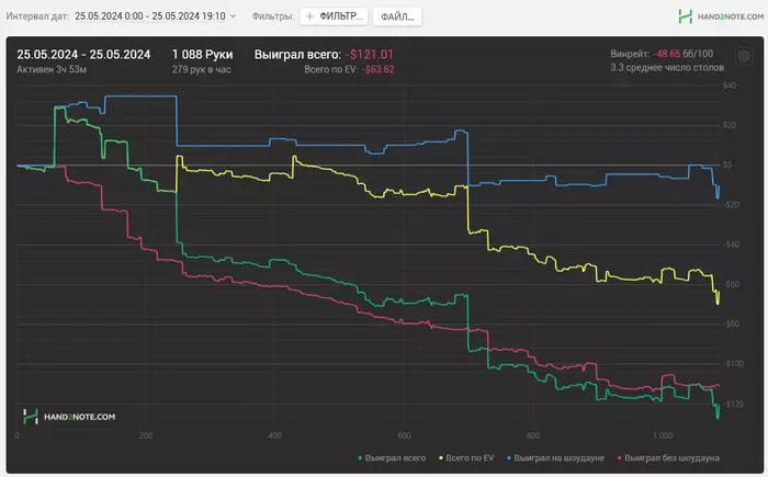 Ничего меня тут не расстраивает, потому как и не было розовых ожиданий, что с ходу разъебу поляну. Более того, немного побаивался, что разъебут меня, как ребёнка, решившего поиграть с ребятами постарше, да ещё и в чужом дворе. Из положительных моментов, отмечу, что в мае наиграл 64 часа из планируемых 60. 30+ часов занимался теорией и разбором раздач. Не самое оптимальное распределение времени, но мне непросто его распределять, в связи с рабочими делами - это раз. И меня дико напрягает огромное количество непонятных ситуаций во время игры, которые я стремлюсь прояснить вне столов - это два. Да, со временем становится полегче играть и всё чаще приходит чувство, что я примерно понимаю какой-то спот, ренжи и лютой дичи в нём не натворю. Наверное это и есть результат наигрыша и работы вне столов.
