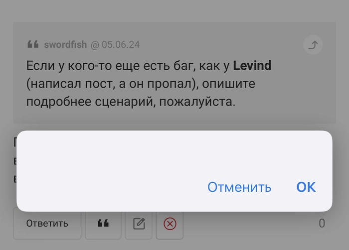 Если у кого-то еще есть баг, как у Levind (написал пост, а он пропал), опишите подробнее сценарий, пожалуйста.