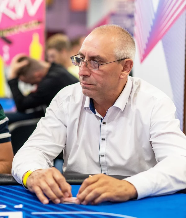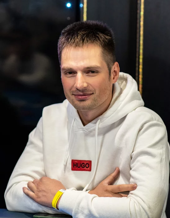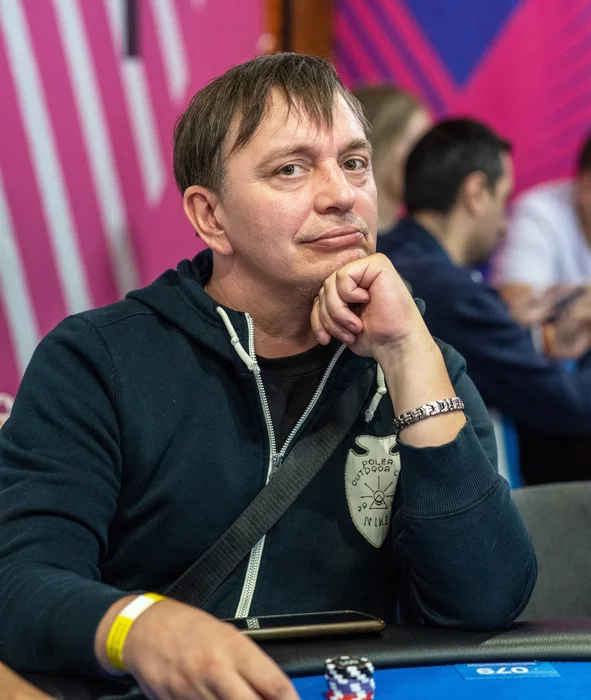 Чуть позже за другим столом выбыл Владислав Гладковский отыграл уже второй вход. Решил побаловаться и поставил страддл, оказался на флопе с Алексеем Говоровым. Выехали на все фишки (эффективный стек 15к): Владислав с , Алексей с .
