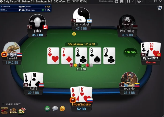 chex230, депнул 100$, только микролимит, максимум турниры за 5, и то редко, с таким бр особо не хочу никуда лезть выше. По курсу 4 раздела прошел, это примерно 20 процентов от всего. Стараюсь придерживаться строго той стратегии, которая с курса, но пока диспа не дает, а только забирает. Стараюсь сразу разобрать раздачи, где вылетаю, на наличие допущенных ошибок, но в последнее время больше вылетов из-за элемента везения, а везет моим оппонентам. Это очень разочаровывает, когда с баттона с коротким стеком например двигаешь олл ин с AJ, на бб обязательно окажется тип с QQ+