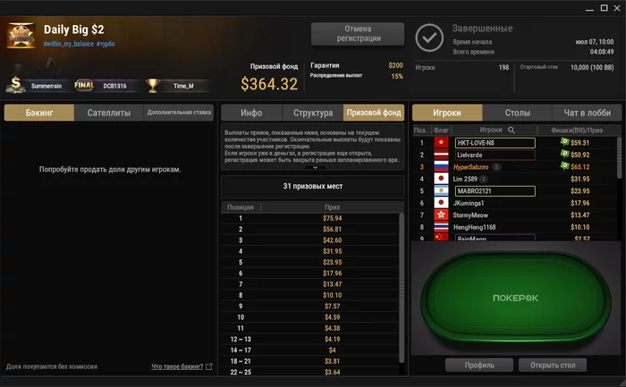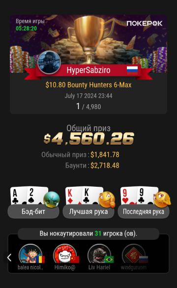 Пока есть время, напишу что да как все было по итогу двух недель. В первую неделю провел только два дня за столами, так как были проблемы на работе, причем серьезные и было совсем не до покера. Если взять в общем две недели, было где то 5 сессий. По результатам две финалки. В первом турнире биг за 2$ когда был чипаком поделили и я получил 65$. Второй баунти за 10$ я вообще как то на изи затащил. Могу сказать что на протяжении всего турнира мне везло нереально, как будто так и должно было быть. Да, были переезды и все такое, три раза был на грани вылета, но на финалку я уже вышел огромным чипаком