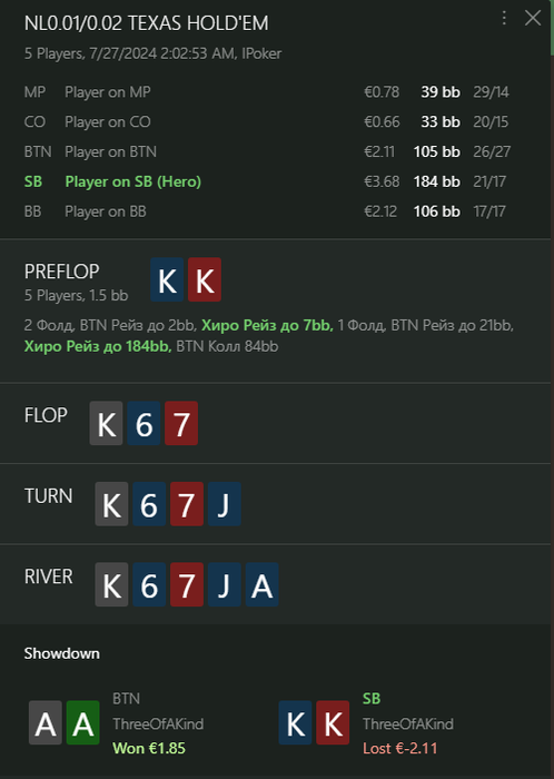 Ещё хуже дела обстоят с префлоп олл-ином. В целом для себя я решил, что я не иду в олл-ин на префлопе имея карты ниже КК(только карманки, и только против стеков короче моего), и реже с QQ или JJ(они больше для стила, поэтому тут могу сам инициировать олл-ин в позиции).
