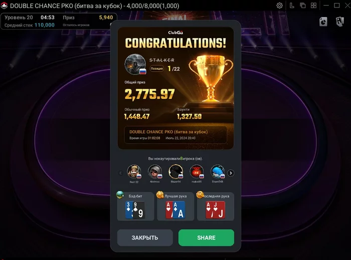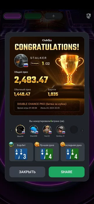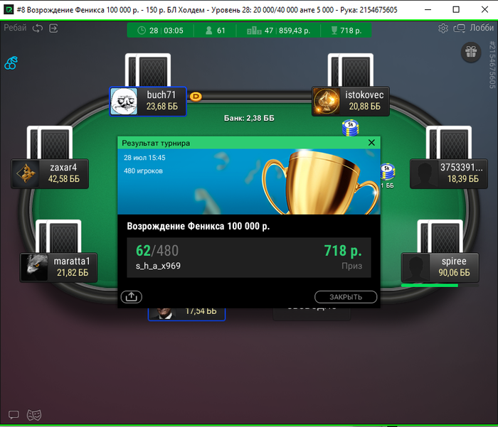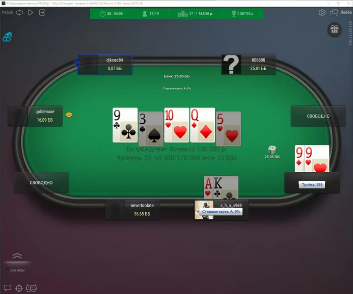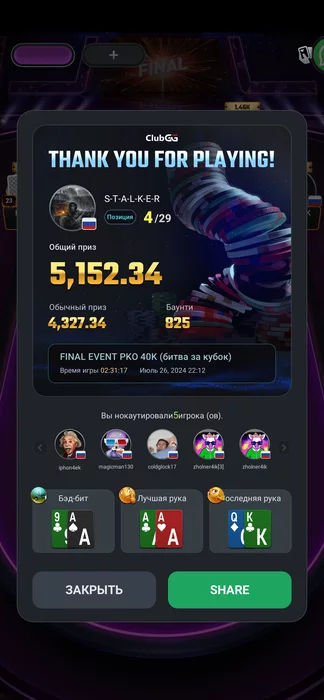 Сегодня откатал наш главный турнир в клубе вышел на финалку чипаком но складывалось просто жесть. Было важное выставление где я поехал за 3 нока но ривер все испоганил, в 4 макс поехал 2 раза и увы ушатали