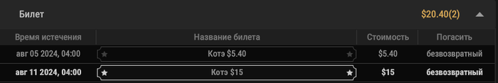 Всем привет. Ну такое бывает только у меня😒 Короче выходил с работы самый последний, проверил все ли вырубил, потом ещё раз перепроверил. Все вырубил. Выхожу и еду домой. Приезжаю, щас думаю душик приму выпью кофе и буду подрубать. Ага и тут я понимаю что общий свет я не вырубил. Думаю ну пиздец. Пью кофе заряжаю пока телефон и еду на работу. Как итог проебано 1:20. Как то так. Пришли билетики но катать сегодня не буду их. На $15 турик вообще нет дат, хз с чем связанно видимо появиться как пройдут отборочные с $5. А они стартуют аж 29 числа. Ну да ладно. Мб прикуплю ещё если нафармлю.