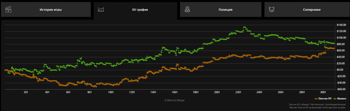 По графику видно лютейшее отрицательное отклонение от ожидаемого. Играл не особо хорошо близко к 0, так еще и такая непруха на -100$. Надеюсь не придется долго ждать когда гсч восстановит справедливость