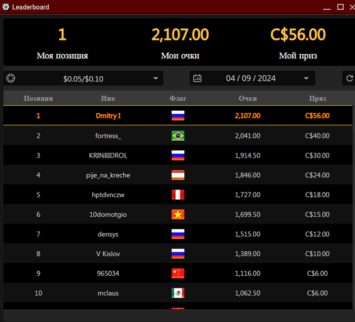 лидерборд 1 место и +56$