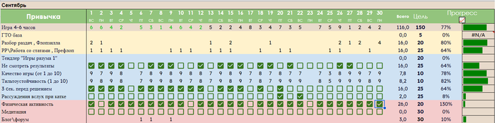 Вот дневник мой , надо сказать , что желаемое количество часов я не откатал , соответственно дистанцию тоже не набил . Но из хорошего теорией занимался регулярно и не прям мало . Тильтовых сессий практически не было а для меня это очень важный показатель , так как залить в тильте 10 стеков за час - это я практиковал😅 Вот размышлять над раздачами вслух очень полезная привычка ,но в моем случае можно выхватить за это в ебасосину . Так как часовой пояс у меня кал собачий и катаю я ночью , а живем мы с девушкой в однушке . Так что я сижу в тишине и темноте клацаю мышкой пока она спит . Я ложусь спать а она следом через пару часов встает утром на работу . Поэтому эту привычку я буду развивать когда уверенно закреплюсь на нл50 поднабью бр и мы переедем в хату где будет возможность сделать мне кабинет🙈))) А еще , вероятно, в будущем Чико подключать буду , пацаны с моего города говорят для нашего пояса заебись вариант - днем катка есть и поле неплохое , правда опять же лучше для нл50 его добавлять так как на нл25 рейк выше там чем на Айпокер значительно . Что касается физической активности тут я в этом месяце сам с себя ахуел💪 . Практически не было дней чтоб я анжуманя не сделал 2-3 подхода . Ну помимо них я еще на площадку гонял в баскет , несколько раз на турнички вылазил а также регулярно на велике катался ) И вообще мб даже в зал начну ходить потом🤔 Медитация - это как-нибудь потом сейчас и других проблем хватает)