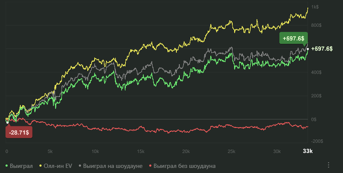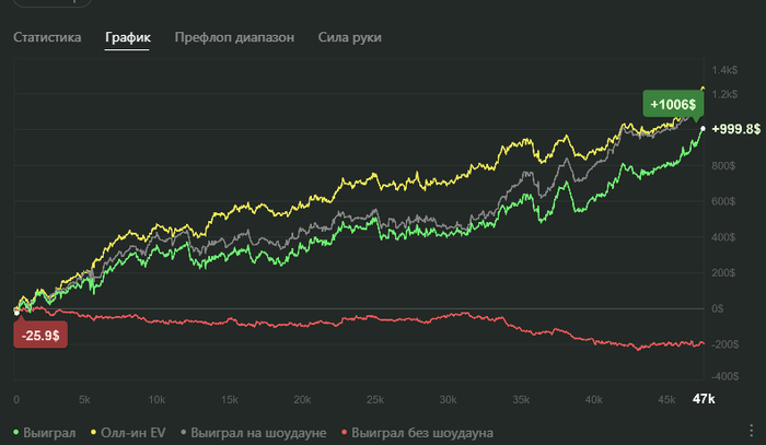 Месяц завершу досрочно , завтра понедельник и катать не буду , займусь таам другими делами , надо по дому кучу всего переделать. мб просто раздачки поразбираем с напарником. Сегодня , к примеру , аж 4.5 часа с ним теорией занимались в два подхода . Сейчас работаем с ресерчами поляны ищем всякие эксплойты там и прочие приколы . И для меня это как будто глоток свежего воздуха последние два дня . Пробуешь внедрять всякие новые приемчики ищешь ситуации для отработки стратегии , напрягаешь мозг , концентрация повышается и катаешь не автопилот а вдумчиво и внимательно , помечаешь раздачки , получаешь удовольствие от процесса. А это главное , чтоб с каефом)) После еще вечером покатал пару часиков.