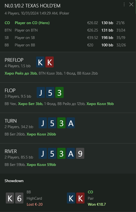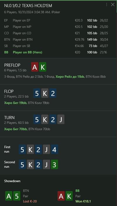 Jarama19, надо смотреть на статы, как по мне выбрана экзотическая ветка в такой борд играть от чека. Думаю на нл20 против дефолтного рега мы почти всегда увидим . Но опп 27/22, такие могут что-то и придумать, пока бы написал нотс что играет с прерывестой агрессией и ждал руки лучше, что бы его вскрыть, ведь если мы чекаем эту доску АК, то похорошему бы и чекать КК, частично дам и можно даже 99, молчу о , которые можно чекать всегда, а вобще можно было и чекать ривер