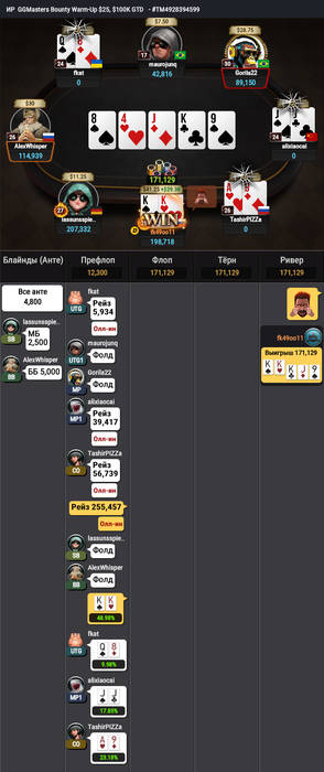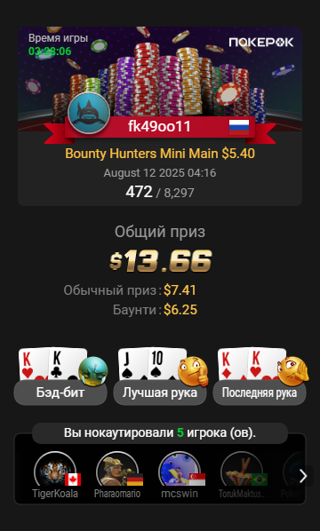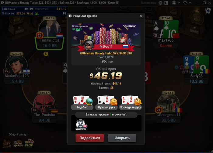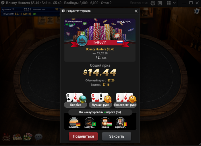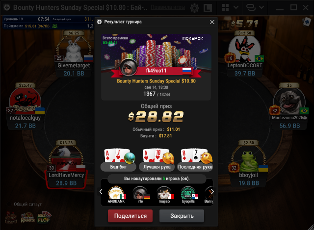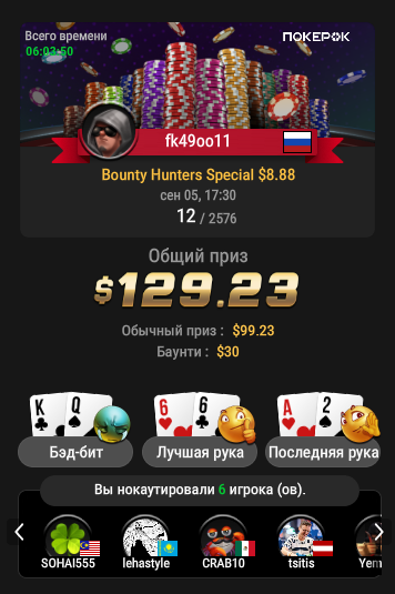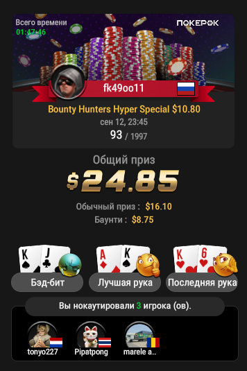 С 2 входа норм крутанулись потом эта суета была в 15 баунти, туда сюда и у нас уже был средний потом, еще пару раздач и у нас уже было 2 средних. Вообще без рофлов думаю что это лучший у меня турнир за всю мою маленькую карьеру в покер, да несомненно скажу что карта заходила, но и я делал хороший действия,(маленько похвалю себя ).