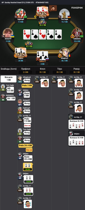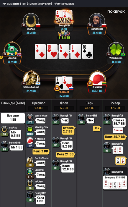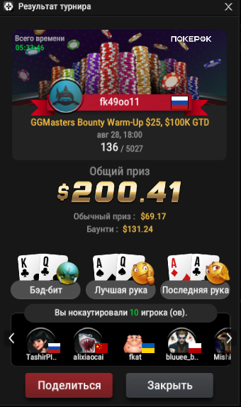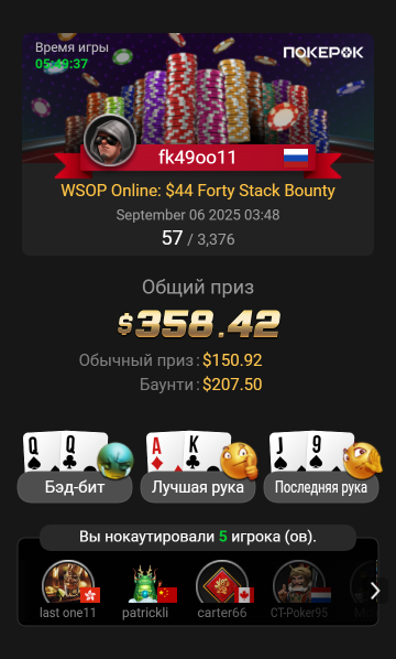 Сыграл где то 5-6 турниров для меня достаточно, более дорогие вывел на экран побольше и 2-3 турнира на всякий, баин не больше 10, самый дорогой сыграл 44 неудачно, бх 21 тоже пролетел осталась у меня 15 баути и 15 гранд ну и конечно же РОПЛ-МЕЙН за 5000, какого мое удивление было что когда открыли стол я увидел у себя 40бб, а у оппонентов по 100бб, позже я узнал что отдыхай в субботу я пропустил 1 день МЕЙНА. (Жесткий косяк)