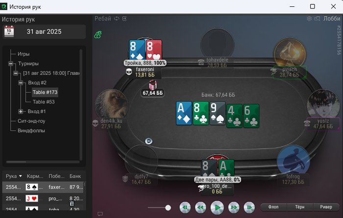 потом прибабл начался и все начали жестко пересиживать, когда осталось 200-150 у нас было 8-7бб