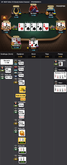 Начнем с 15 баунти , первый патрон пролетаем,5 минут курим идем 2 раз, со второй начали сдавать красивые, быстро набрали стек, укрепили, сидели активно катали, после попадания в призы были даже топ-2 по фишкам в турнире.