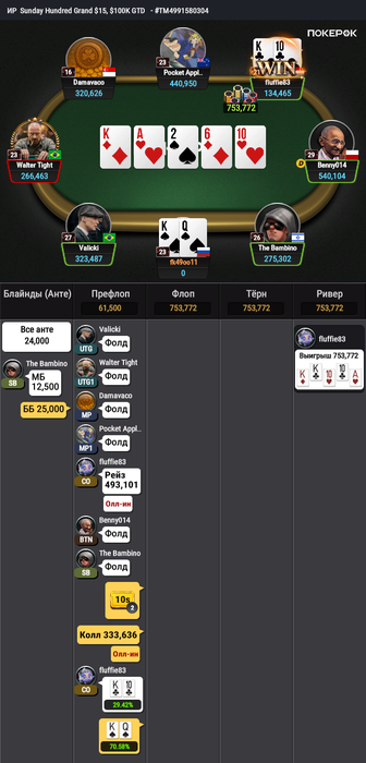 Гранд за 15, не плохо смотрелись в этом турнире, играли достаточно спокойно, но за очень хороший стек не смогли выиграть хоть и поехали очень хорошо.