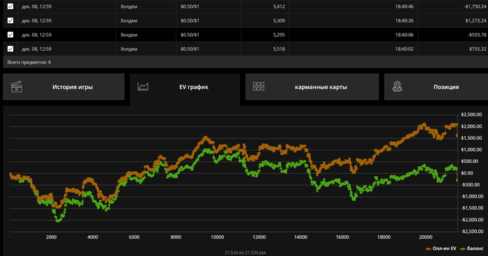 На гг в этом месяце творилось просто что-то невероятное, даже в июле когда результаты были в -3500$ до рб не было такого ощущения беспомощности просто в каждом поте. За 16 дней у меня был только 1 день с выигрышем на шд больше 48% и только сегодня второй такой день, еще вчера общий выигрыш на шд за месяц был 48.3% при графике елочкой и красной в -6бб на 110к рук поймать такой выигрыш это за гранью. За эти 2 недели мне показали 300 сетов+ в 3бет и 4бет потах, разница в выставлениях за эти 110к рук на гг с обычным раном 2500-3000бб всего за 2 недели игры. Если в ноябре не поймаю какой-то апстрик за октябрьский ран то это будет последний месяц что на гг что в раше, лучше буду бамхантить обычные столы или играть полумертвый зум на старзах, чем тратить столько нервов в этом катране.