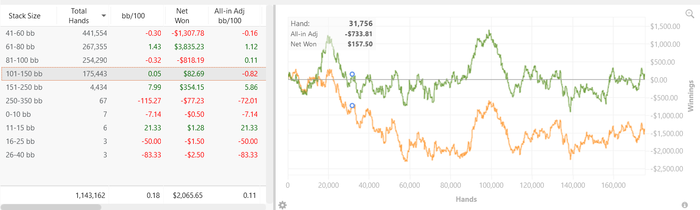 Да, начинаю я по мсс, потому что в зуме винрейта все равно нет,а так диспа поменьше( в деньгах, в байинах может и больще) ну и так как играю не очень долгие сессии то так проще не наделать дорогих ошибок на старте. На гг сбросить стек ниже 100бб все равно нельзя поэтому играю как придется, часть столов мсс,часть бсс В целом что по мсс что по бсс результаты одинаковой паршивости, в стеках 60-90бб во всех румах винрейт выше в разы. Если при среднем винрейте в каком-то руме в 5бб мсс будет в ноль ,бсс в какие-нибудь 4бб то стеки 60-90бб будут в 10бб