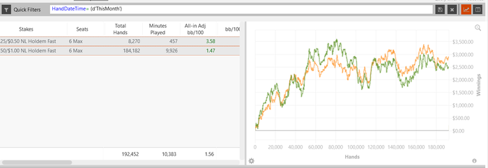Октябрь 2024, 168 часов игры, по кассе примерно +6250$. Что по игровым часам, что по количеству рук удалось с большим запасом побить прошлый рекорд в 150 часов. Единственное но в этих 168 часах что 50 из них с нл25 в начале месяца, зачем надо было тратить 10 дней чтобы проверить что там на нл25 не очень понятно