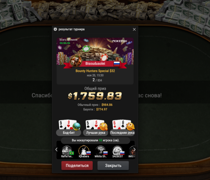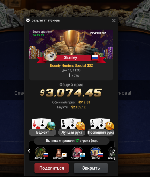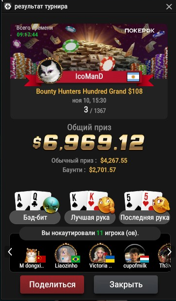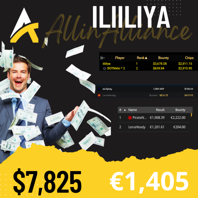 💪Мы поздравляем наших чемпионов с отличными результатами этой недели! Особые поздравления Алексею (Gamermen) за невероятный занос в $9,127, за 2 место в турнире $55 Mini Bounty Builder HR (Progressive KO). Твой успех – это пример мастерства, силы воли и блестящей игры!