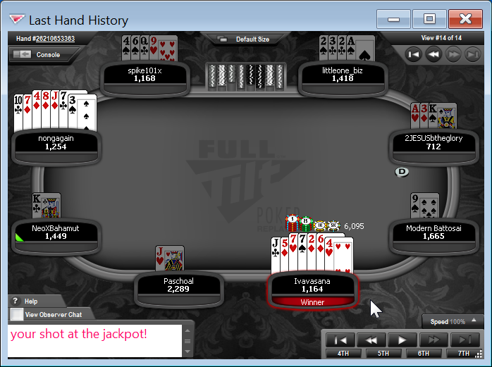 Final Pot: 60.95 BB Hero shows 5 4 7 7 2 6 J (7,6,5,4,2) nongagain shows T 7 4 8 J 7 3 (T,8,7,4,3) Hero wins 60.95 BB Зацените скриншот: your shot at the jackpot!