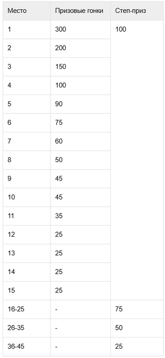 Призы получают топ-15 участников, победителю достается 600. Кроме этого, степ-приз достанется 4 игрокам из топ-45, по одному из каждой группы случайным образом: