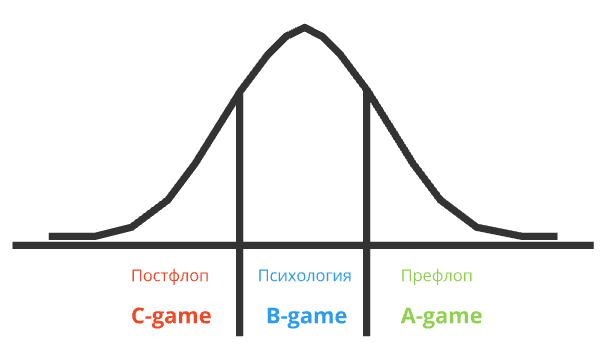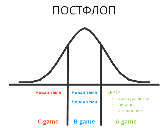 Постараюсь объяснить эту концепцию с точки зрения практического применения. В покере существует три основных направления, в которых нужно развиваться: префлоп, постфлоп и психология. В каждом из этих направлений есть отдельные темы, на изучение которых нужно потратить немало времени. Представим, что вы хорошо поработали над своей игрой на префлопе, а также уделяли время психологической составляющей игры, например, начали проводить разминку перед сессией и заминку после нее, а также читаете мои посты на тему #Психология и вот теперь хотели бы перейти к изучению постфлопа. В этот момент ваш диапазон ("Землемер") будет выглядеть примерно так:
